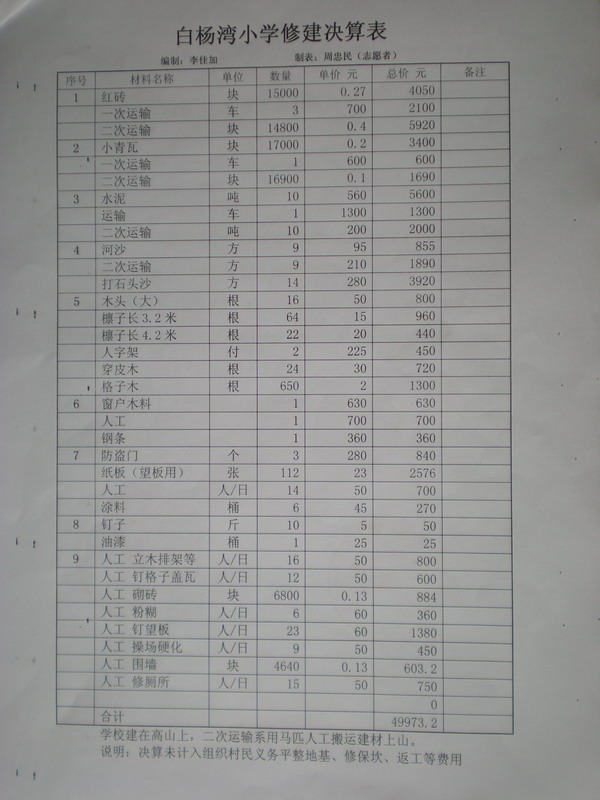 总计:51137元 建议捐款55000元,其中3863元用于解决通电通水上(约距离水源350米,电源100米)。