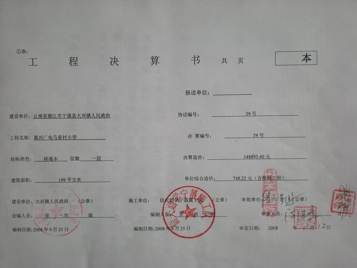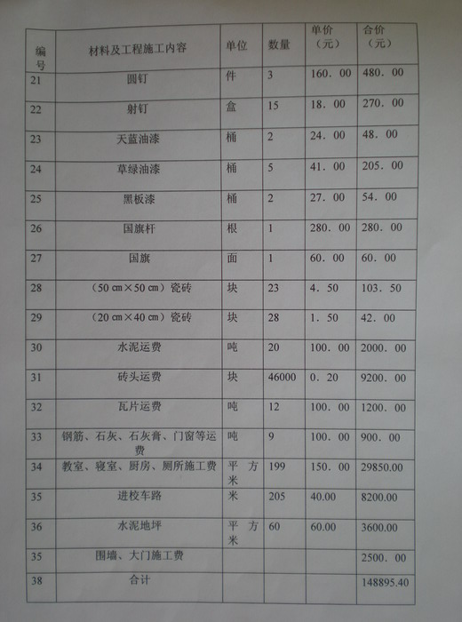 2、现在当地建筑材料比较紧张,砖头被阿海水电站提前购买,买砖困难。柴油也要排队2公里,并限量加油,运费增加。施工费也在涨价,原来为130元/平米,现在市价为160-170元/平米,我们预算压价为150元/平米,课桌原来是100元/套,现在为120元/套。