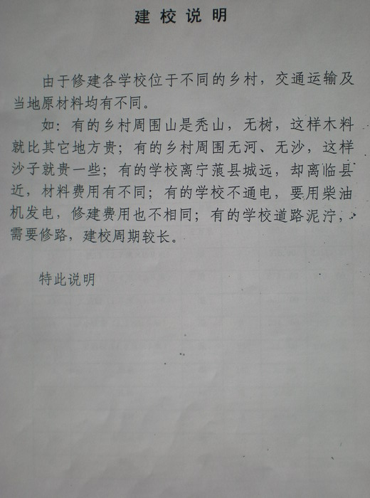 如:有的乡村周围山是秃山、无树,这样木料就比其他地方贵;有的乡村周围无河、无沙,这样沙子就贵一些;有的学校离宁蒗县城远,却离临县近,材料费用有不同;有的学校不通电,要用柴油机发电,修建费用也不相同;有的学校道路泥泞,需要修路,建校周期较长。