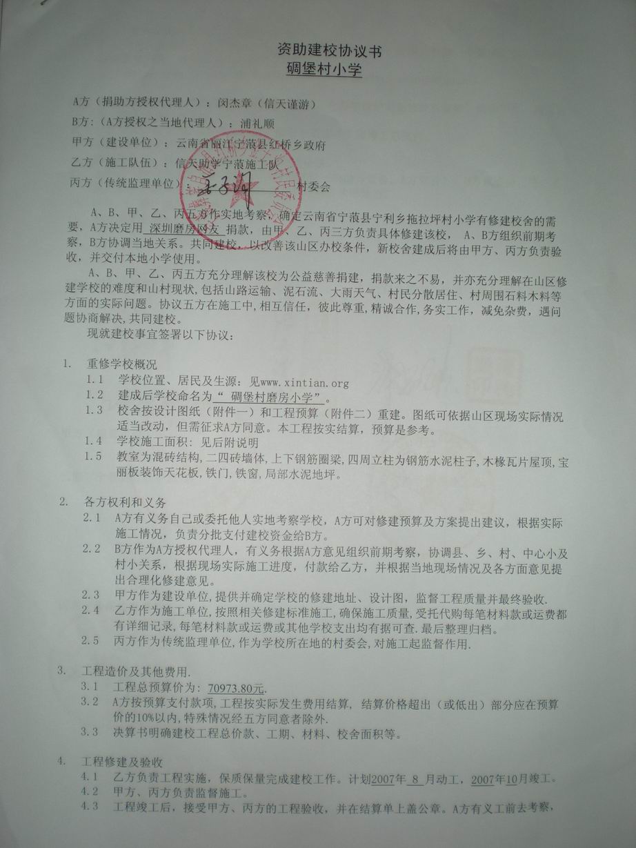 至2007年9月4日,本次募捐建校活动第一期筹款截止,合计收到汇款RMB38,984.99元,顺利完成捐款目标。第二期筹款已于9月25日截止,提前完成募款RMB35,73.8元 。由衷感谢每一位朋友的热情关注与大力支持!