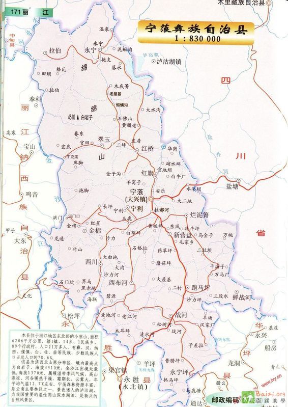 宁蒗县约25万人口,2008年全县的财政收入达到5000万,突破历史新高。往年宁蒗县的财政收入都在2000万左右,主要是卖木头的钱,从1998年起,国家禁伐天然林,收入就来自工业,煤矿,铜矿和国家投入的阿海水电站的税收。