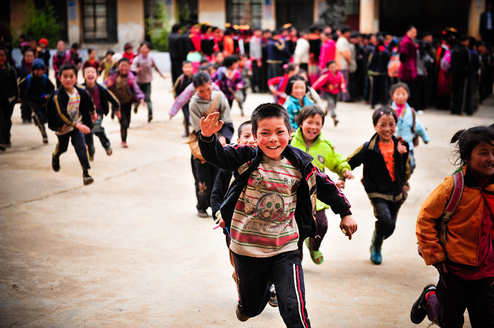 : [听到吃肉的小学,一下课,学生们就飞奔过来]