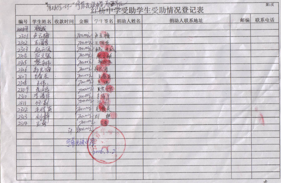 国内捐助者:一次汇款额为全学年的费用1400元(每学期为700元)。包括学费,住校费,资料费等费用,2006年8月再汇一次。(注意看下面第6条)