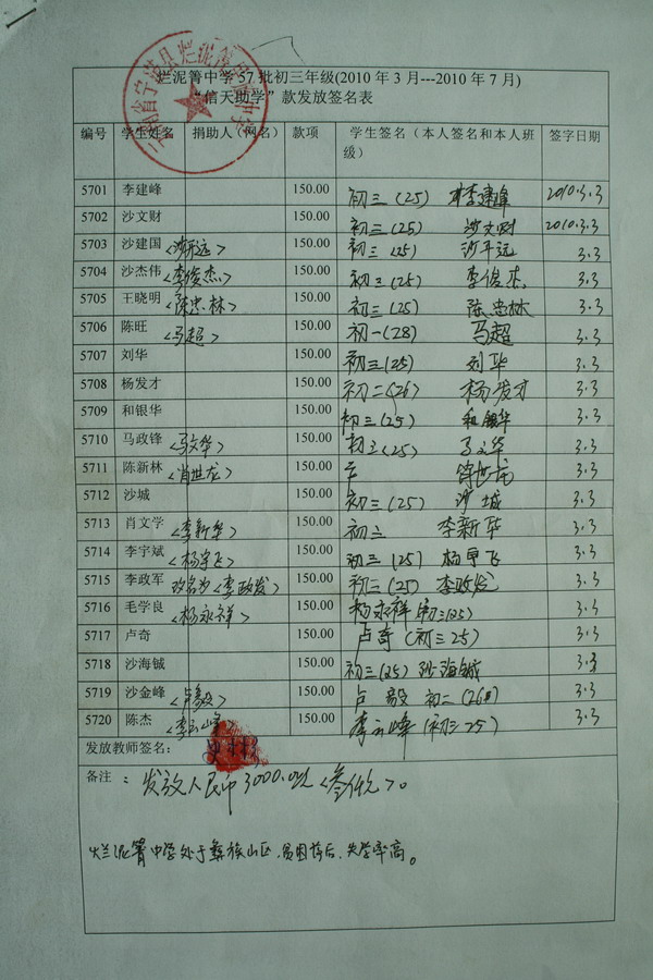 7、全部捐助款到漫步轻灵这里后,她会按学期分次汇给浦理智老师,浦理智老师和学校的负责老师再分发给受助学生(学生每学期收到150元),一一签字确认。知识改变命运,愿这些学生将来不再重复父辈们那艰辛苦难的日子。