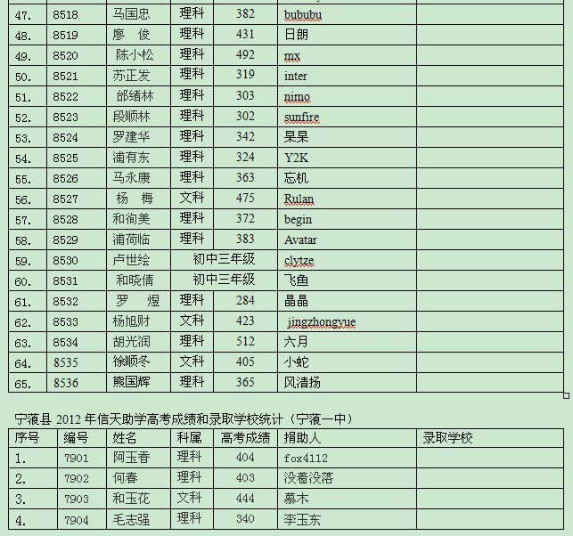 宁蒗县2012年信天助学高考成绩和录取学校统计