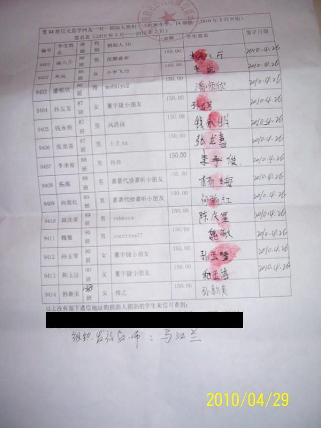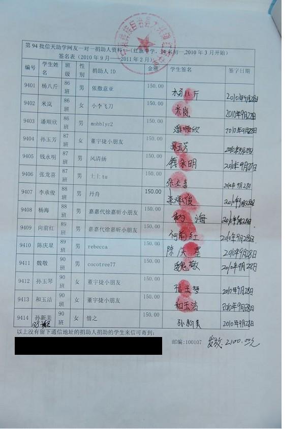 红旗乡中学94批(2010年9月-2011年2月)信天助学款发放签名表