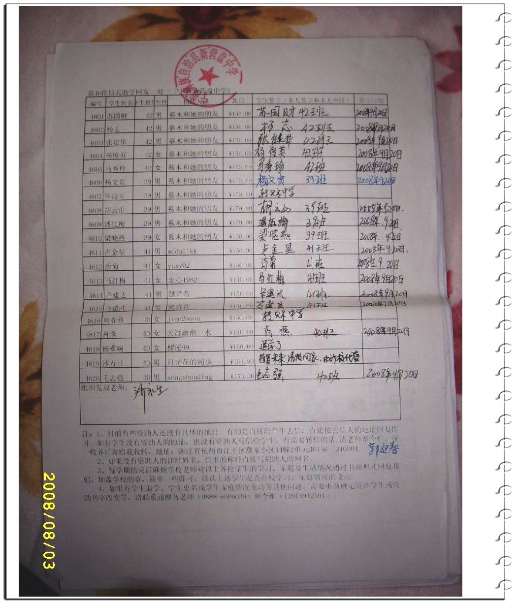 初二年级学生,编号4601-4620:资助款为750元/人,一次捐出(五个学期),07年3月-09年7月,共五个学期。