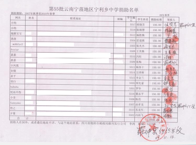6、捐助款收齐后,由凌之按学期汇给学校的联络老师,由老师负责发放给学生。学生的签收单会按学期返回到凌之。凌之将在网上公布,请注意后花园呼朋版的固顶贴《助学大全》。