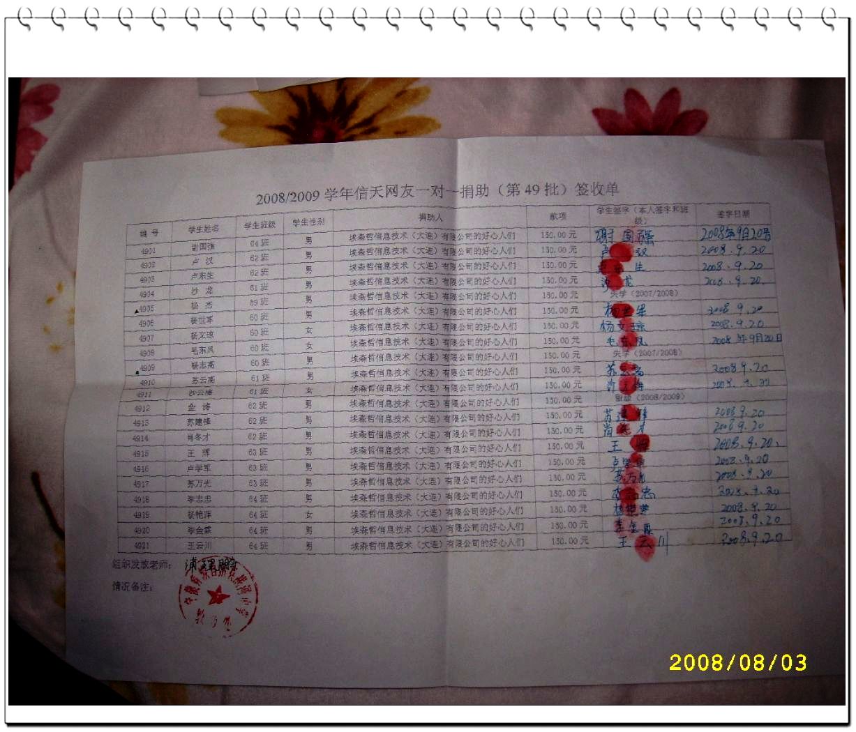 3、资助时间及金额说明(目前的标准是150元/人.学期):调查时为初一年级即将结束,编号4901-4920:资助款为600元/人,(四个学期,初二年级到初三年级,07年9月-09年7月,共四个学期,按学年进行汇付,每年总款为6300元。我们按学期,向受助学生发放资助费,由具体负责老师组织学生登记发放,最后我们统一在网上公布签收单。