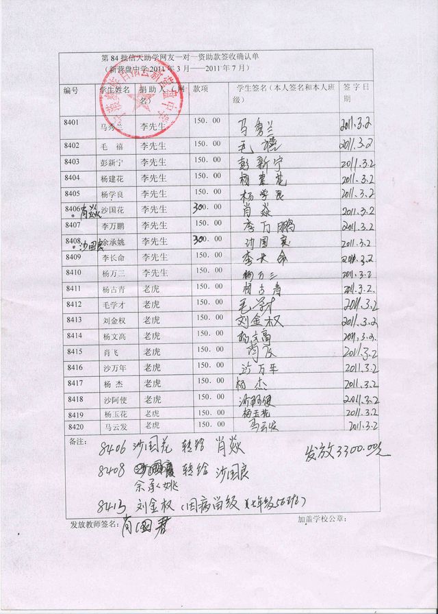 7、资助款来源:李先生捐助8401-8410号共计10名学生;老虎捐助8411-8420共计10名学生