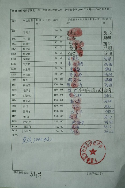 我们将收取全部六个学期的资助款,每学期初汇给委托老师浦理智老师,由浦理智老师和新营盘乡中学的老师按学期组织向受助学生发放资助费,最后我们统一在网上公布受助生领款签收单。