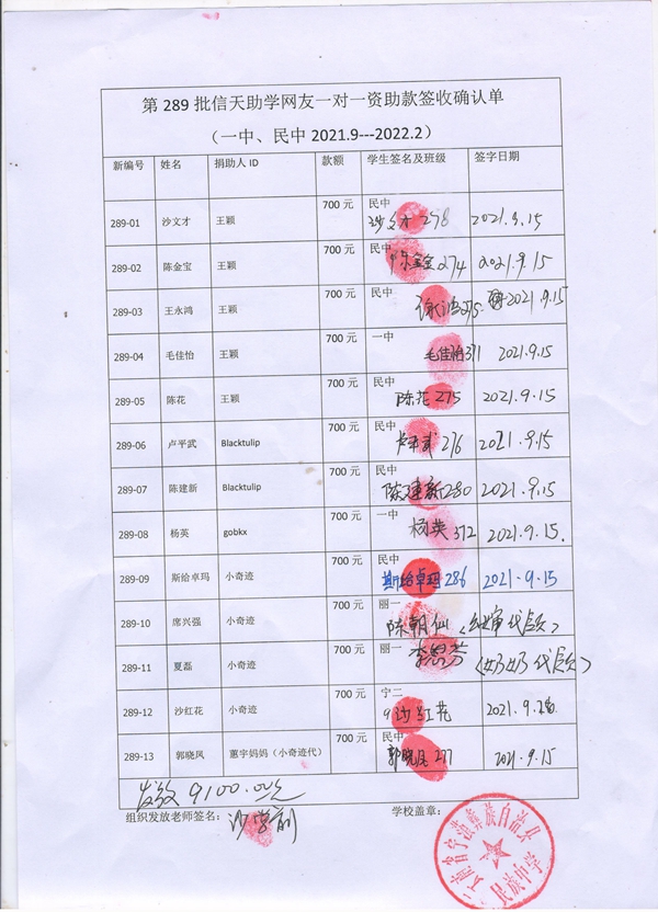 第289批高中续捐(2021年9月-2022年2月)受助学生签收单