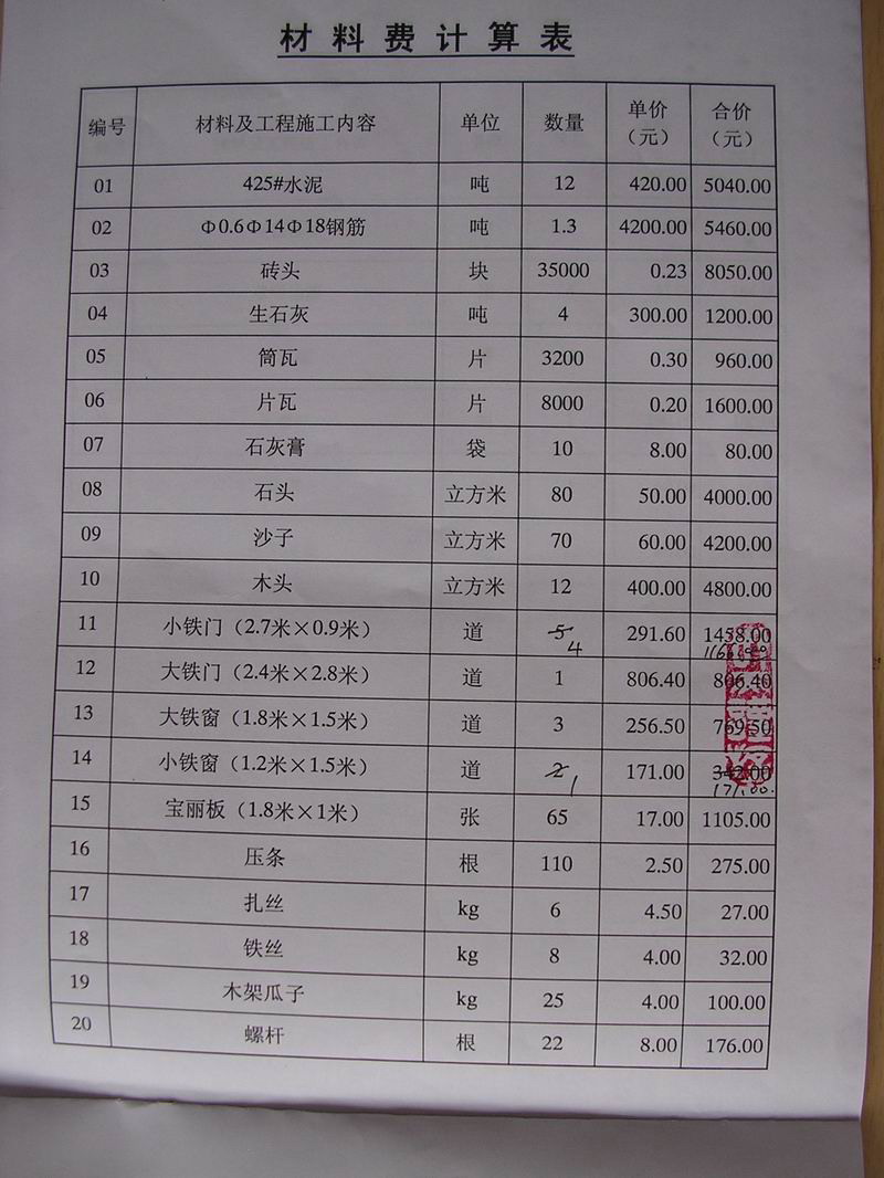 1)                水泥(425#)        12吨*420.00元/吨        5040.00