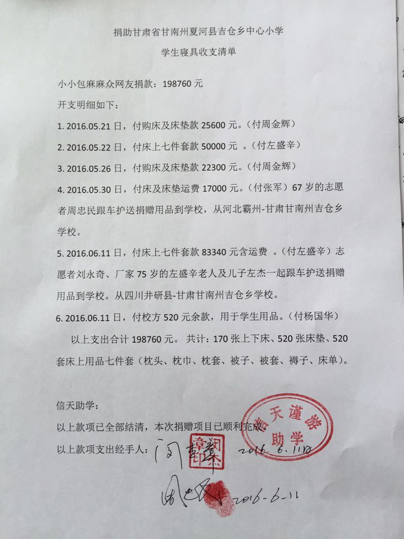 最后捐赠款198760元,全部用于购买捐赠物资和运费。整个捐赠项目所有志愿者的活动费用均自理,没有占用一分捐款。