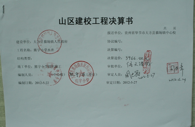 标题: 贵州毕节熊宇小学水井预算