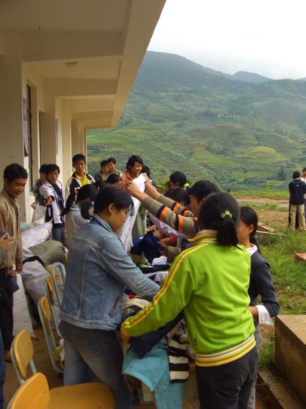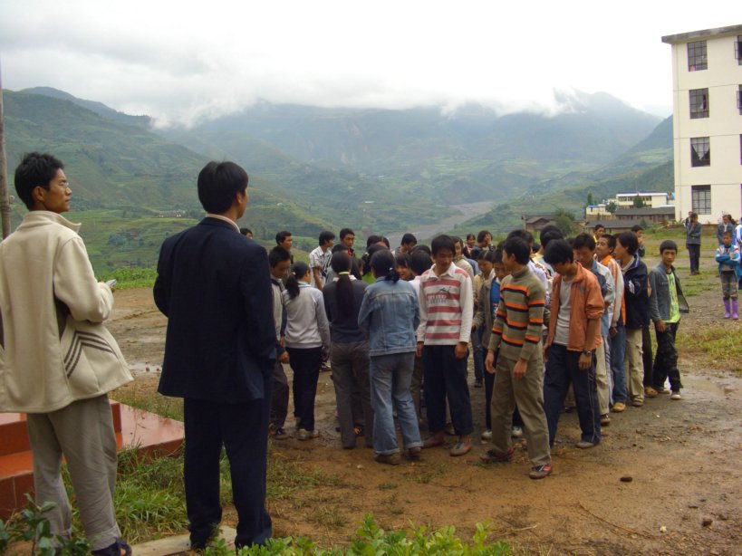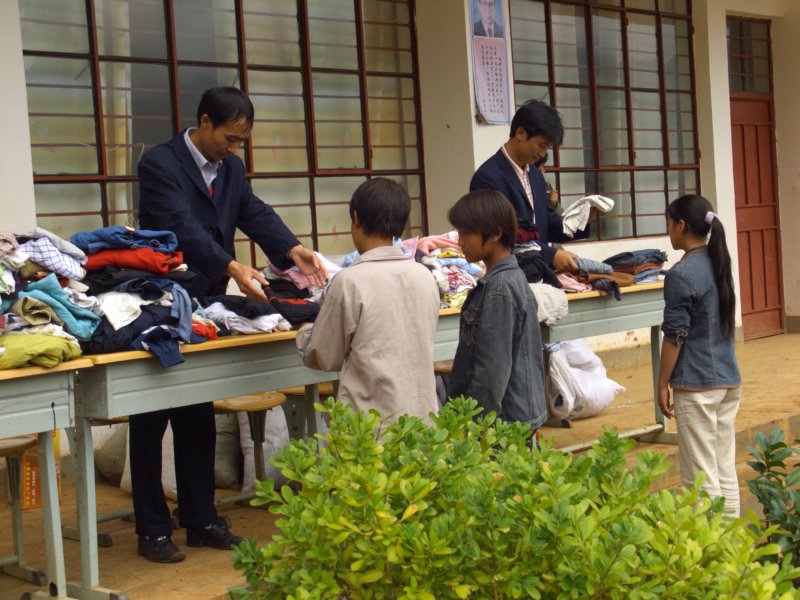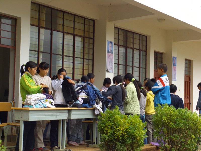 本来没注意这个场景的我,一下明白了,刚才那样学生整整齐齐排队领服装,一定程度上是为了组织起来给我们拍领捐赠衣物的照片。想想也是,那些衣物有大有小,学生有大有小,怎么会那么顺利的分完,拍的时候我还有点纳闷呢。