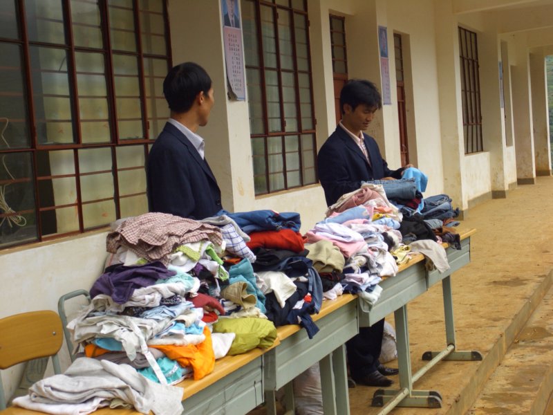 这个画面我也想过需不需要贴上来,想了想,还是把这一段实际情况发上来了:有些学生拿着还不合适的衣物在交换,各取所需
