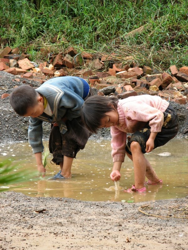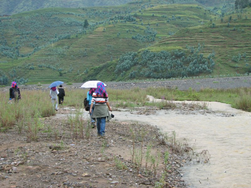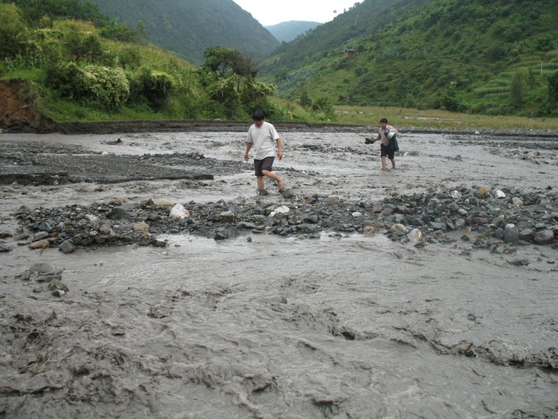 两位老师又来招呼我们,他们是山里人,来去惯了,说着没事没事,一人背着一个女孩就开始趟水过河