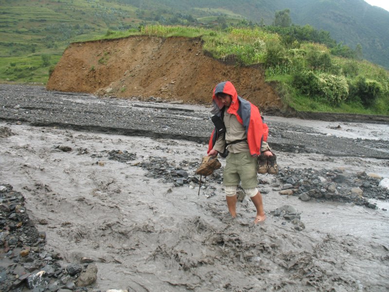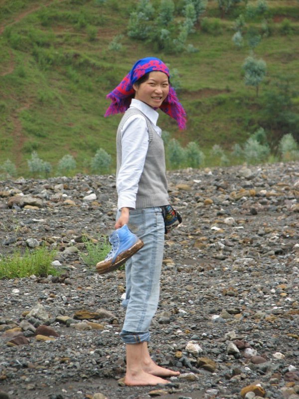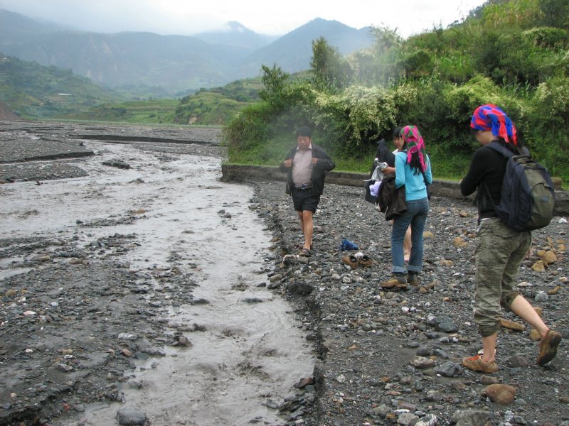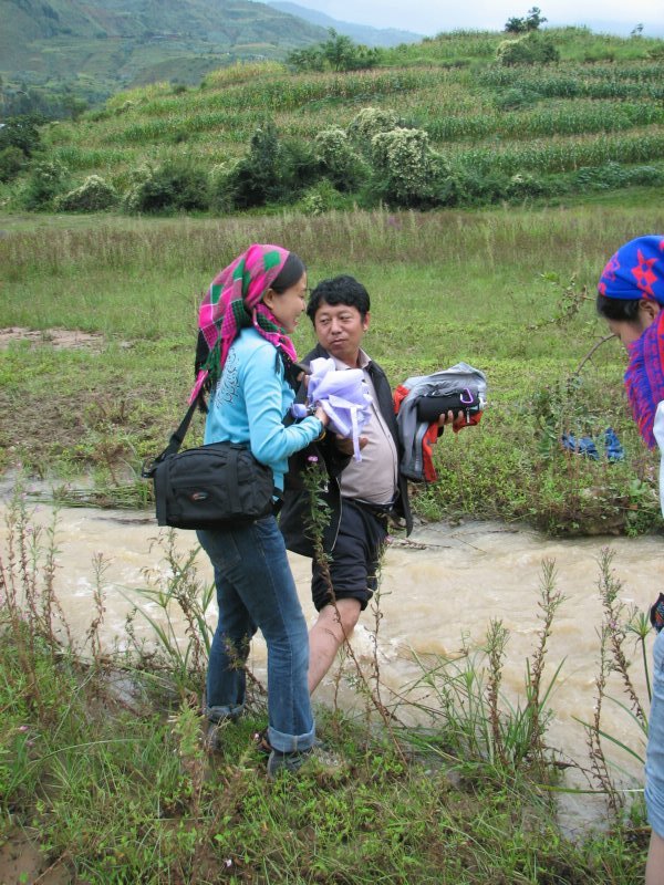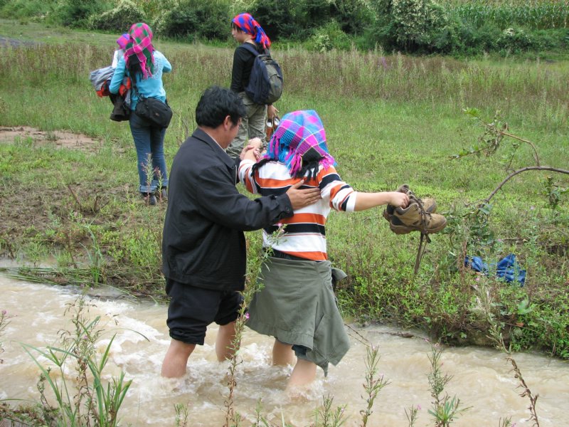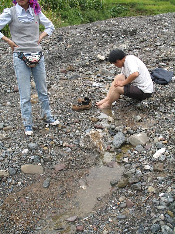 不忍老师这样来去,这边的瓦蓝和阿春已经开始挽裤腿,我的鞋早就进水进泥差不多了,那就一起穿鞋过河吧