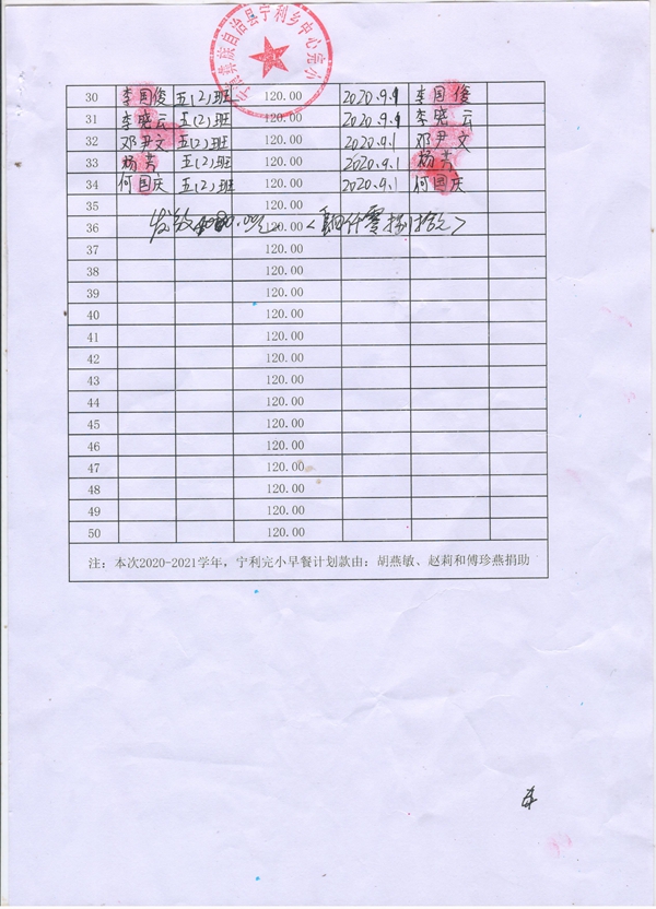 宁利中心完小,2020-2021年早餐计划第一次发款签收单