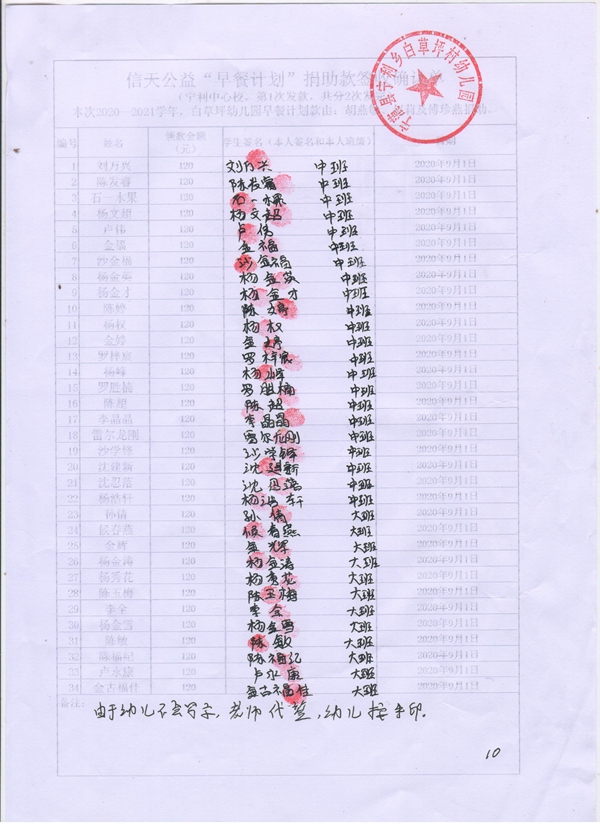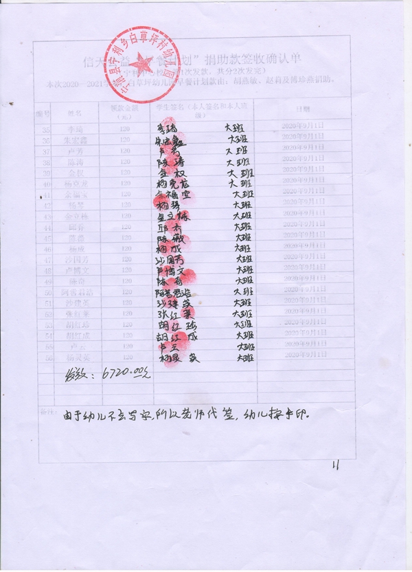 白草坪幼儿园,2020-2021年早餐计划第一次发款签收单