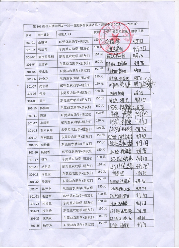 第301批蒗蕖中学(2021年3月-2021年8月)受助学生签字确认单