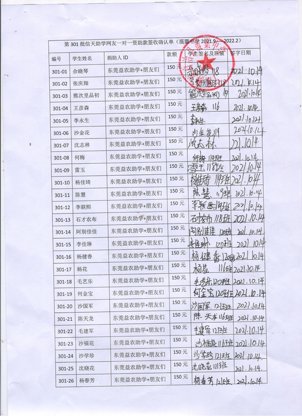 第301批蒗渠中学(2021年9月-2022年2月)受助学生签字确认单