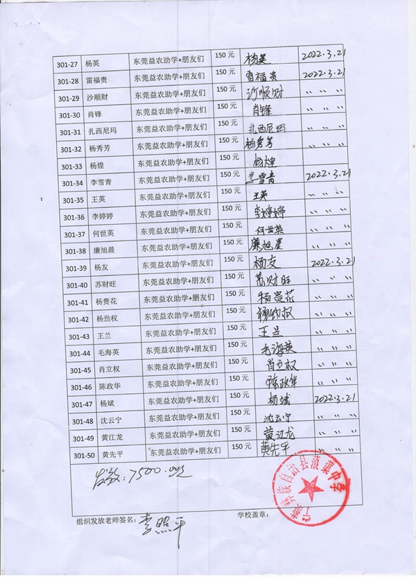 第301批蒗蕖中学(2022年3月-2022年7月)受助学生签字确认单