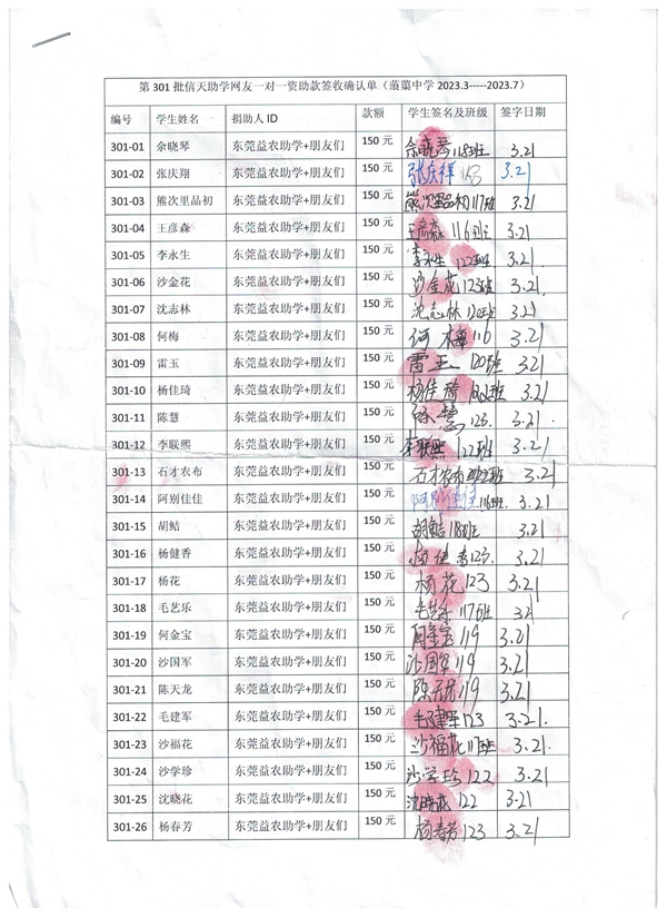 第301批蒗蕖中学(2023年3月-2023年8月)受助学生签字确认单