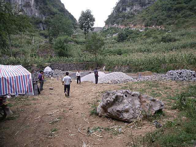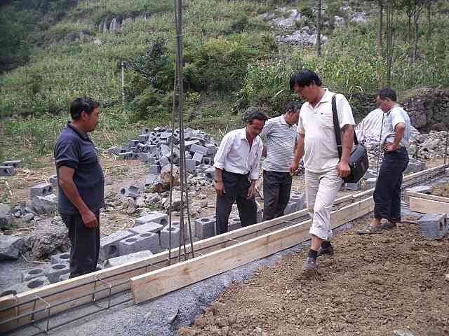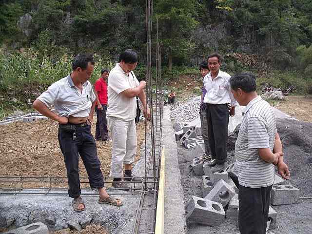 在工地上的水淹塘村村长及中心校校长和村干部在检查施工质量
