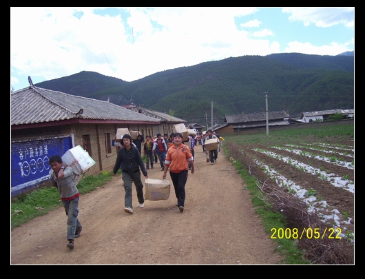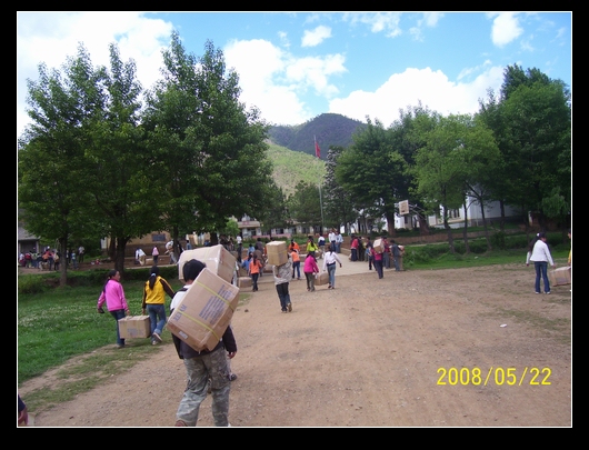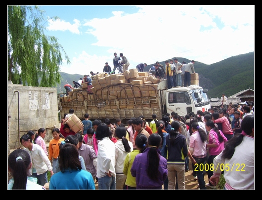 今天晚上(5月22日),接到云南宁蒗县红桥中学浦老师的短消息:"捐赠物资已到了一大车,确实像山一样,全校500多名学生搬了2个钟头."