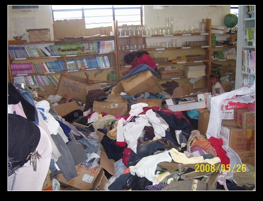 2008年5月22日下午2点, 我们红桥中学收到了”广州爱心人士”捐赠的物资(主要是衣物)一车;23日下午4点,又收到两车,计3280箱.