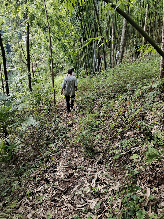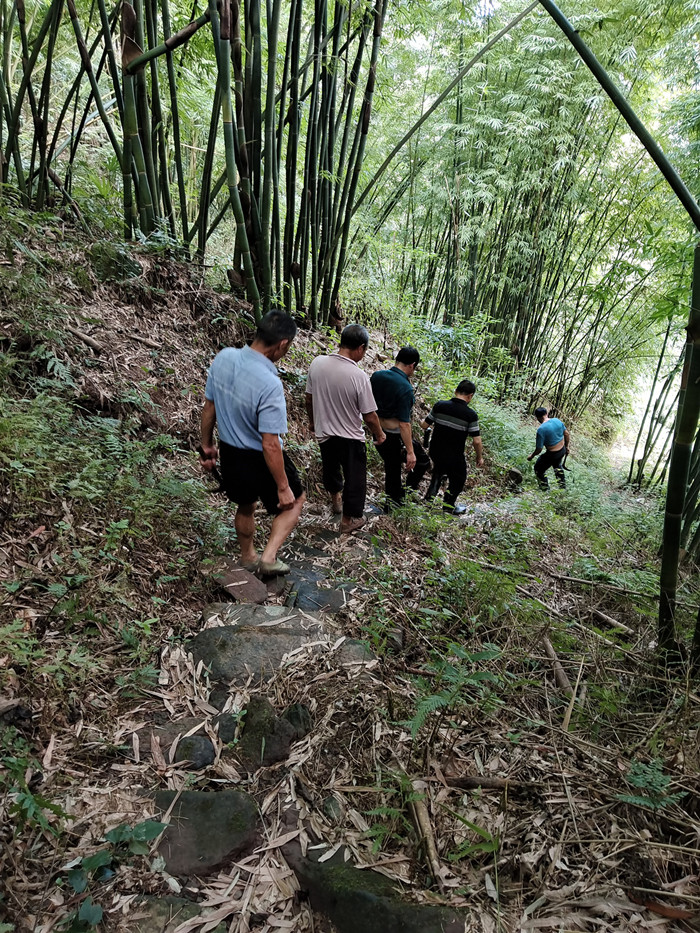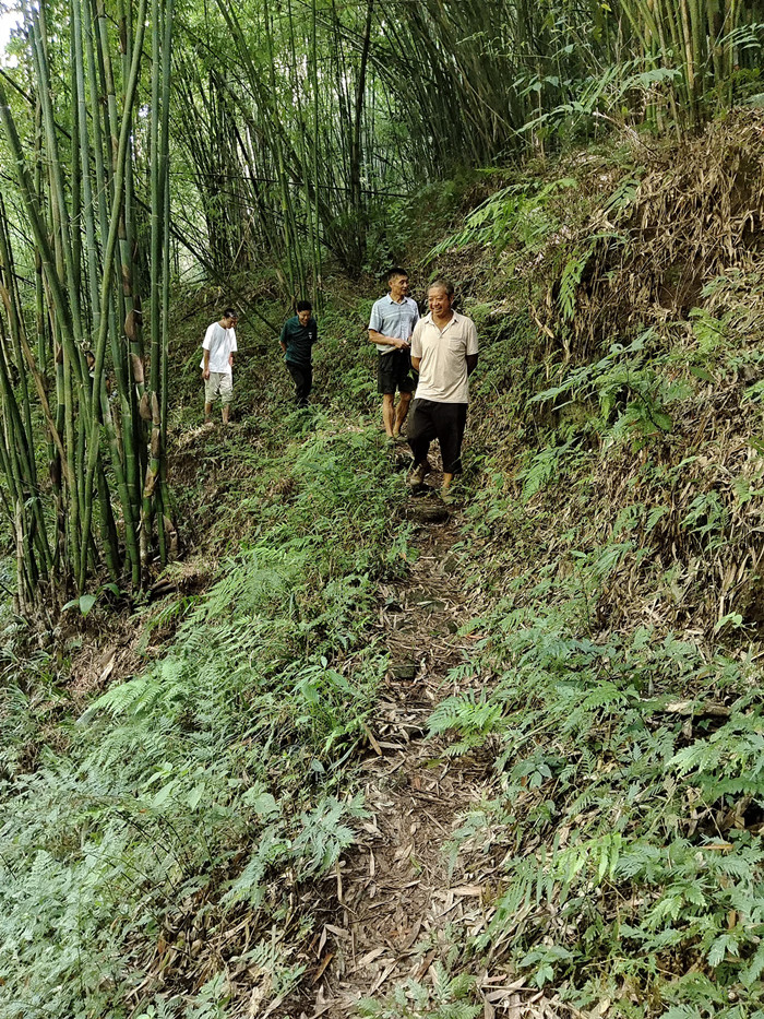 村民勘察路线,计划把这里的羊肠小道扩宽修建成能跑四轮车的乡间土质公路。