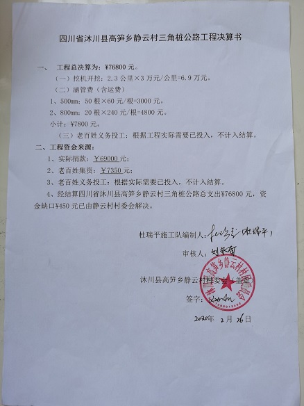 (5)修路预算分好几部分,有挖掘机、涵管、炸药爆破(山崖需要爆破)、堡坎、村民义务工、征地等。修路,我们不全包,我们出一大部分钱:挖掘费用、山崖爆破等。村民出义务工、涵管、征地费、村民小额集资。