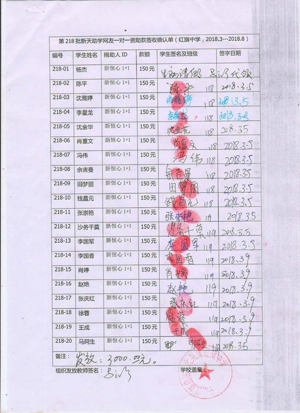 第218批红旗中学(2018年3月-2018年8月)受助学生签收确认单