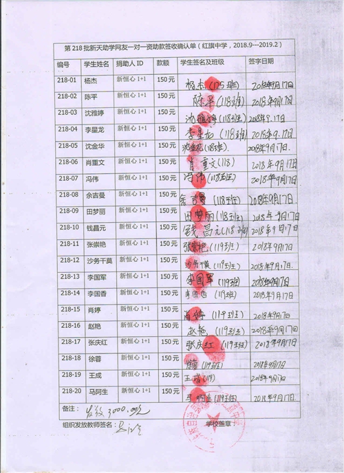 第218批红旗中学(2018年9月-2019年2月)受助学生签收确认单