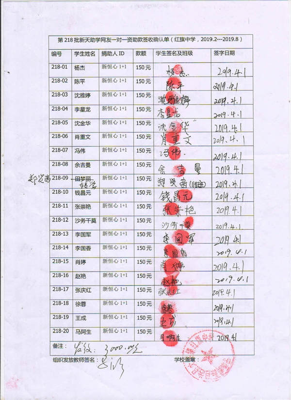 第218批红旗中学(2019年3月-2019年7月)受助学生签收确认单