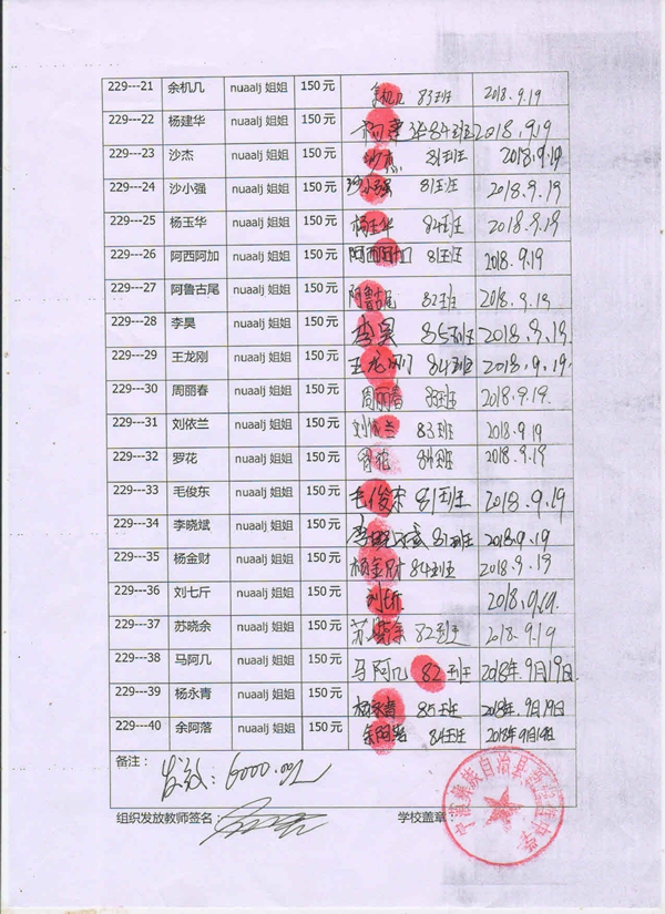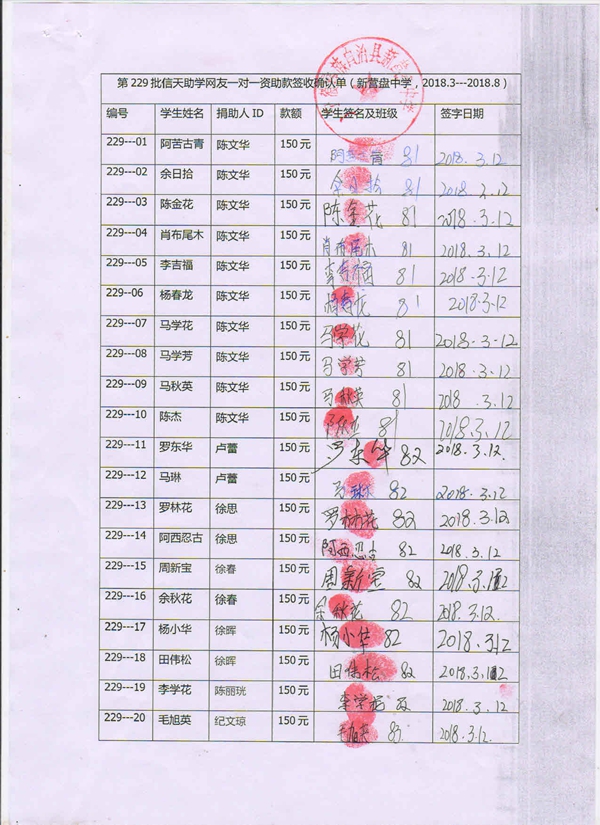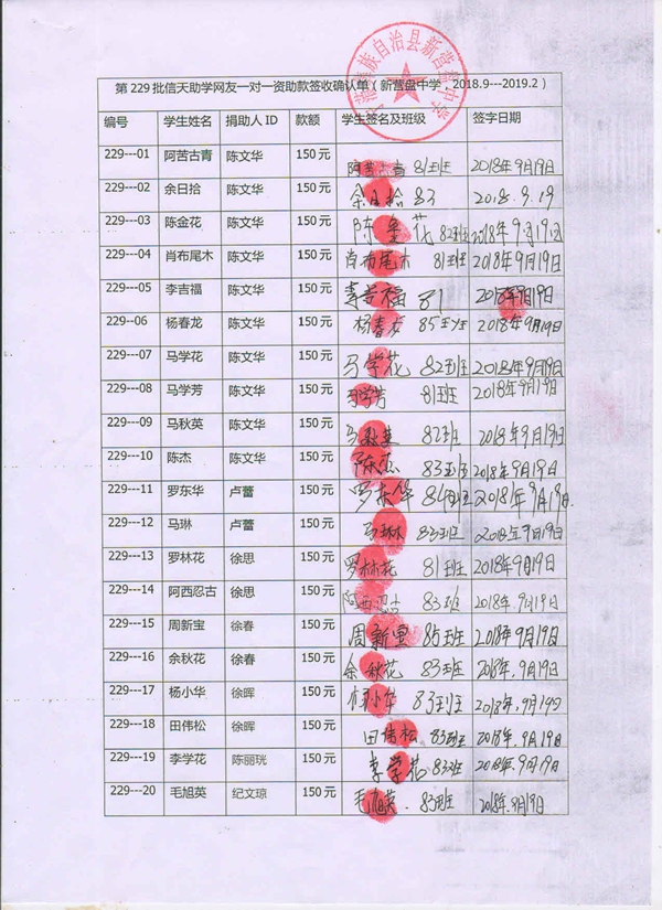 第229批新营盘中学(2018年3月到2018年8月)受助学生签收单