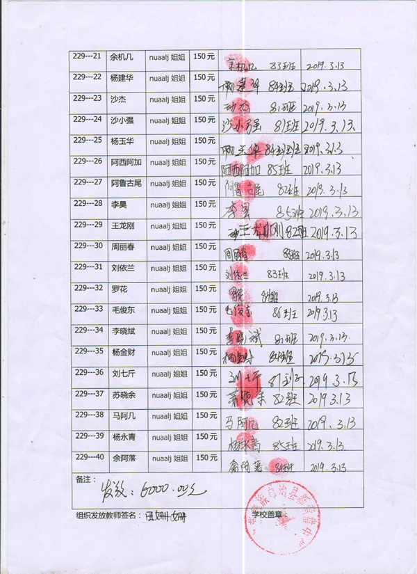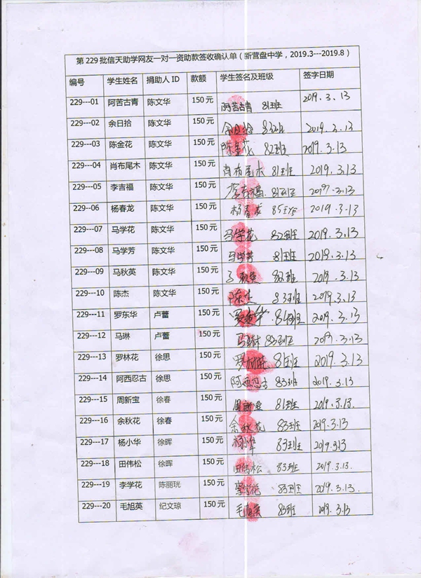 第229批新营盘中学(2019年3月到2019年8月)受助学生签收单