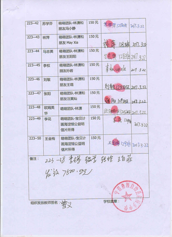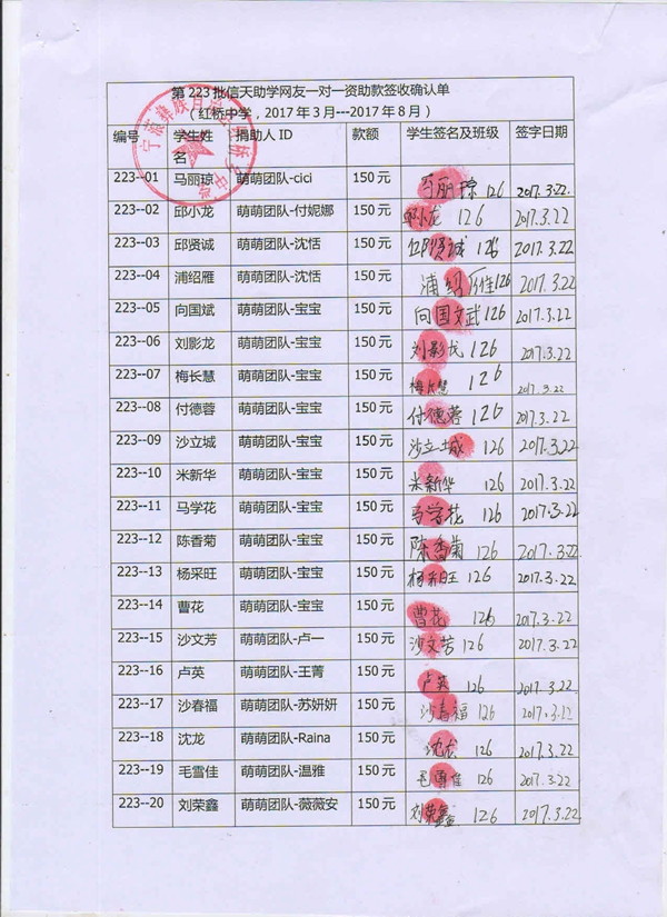 第223批红桥中学(2017年3月-2017年8月)受助生签收单