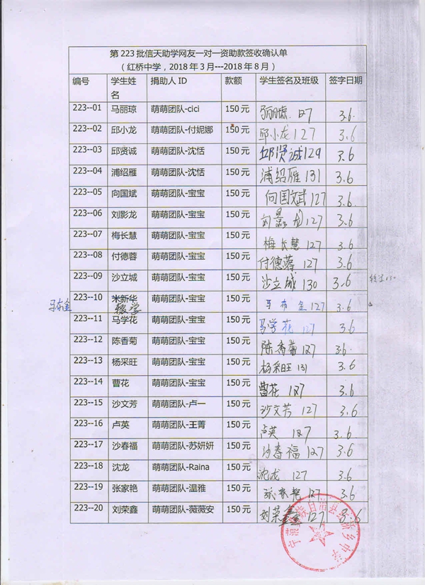 第223批红桥中学(2018年3月-2018年8月)受助学生签字确认单