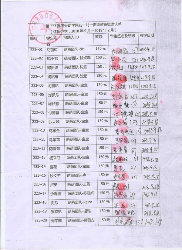 第223批红桥中学(2018年9月-2019年2月)受助生签收单