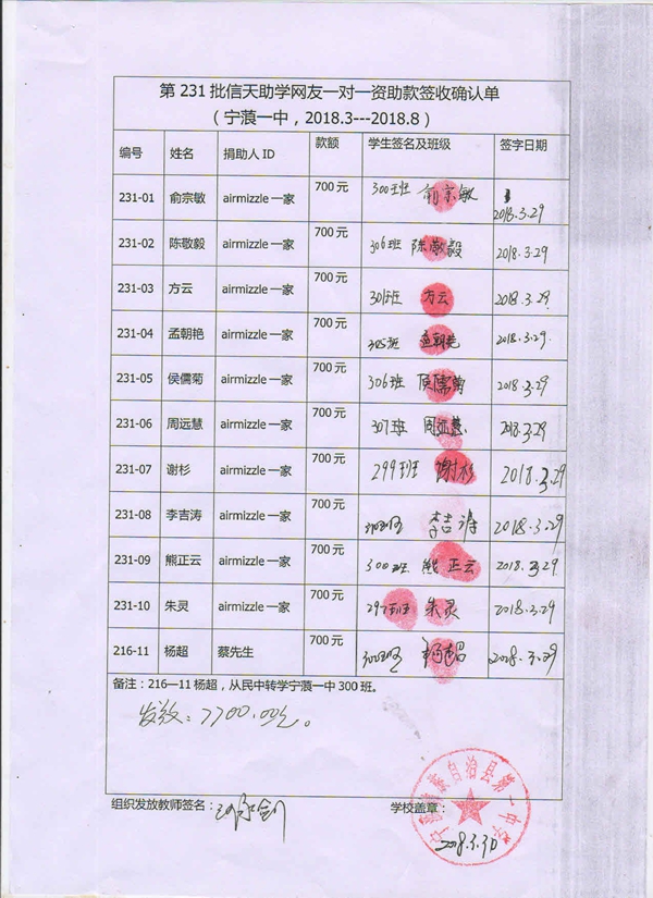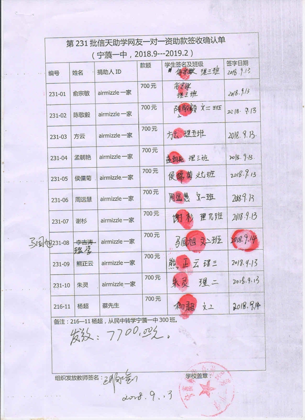 第231批宁蒗一中(2018年3月-2018年8月)受助生签收单