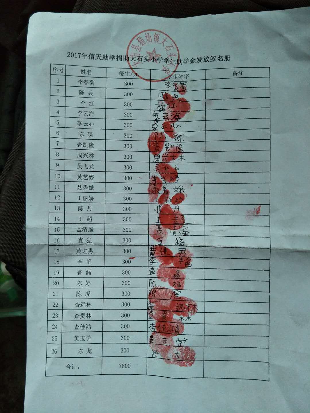 发放助学金签收单。