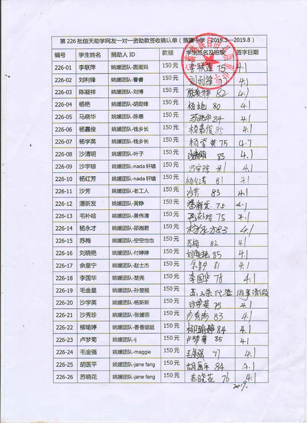 第226批蒗渠中学(2019年3月-2019年7月)受助学生签字确认单