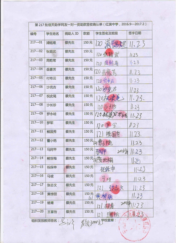 第217批红旗中学(2016年9月-2017年2月)受助生签收单