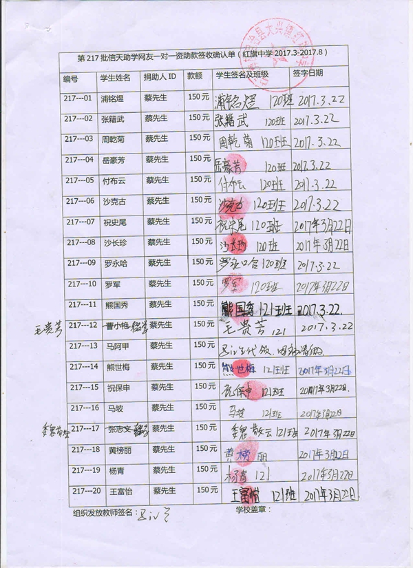 第217批红旗中学(2017年3月-2017年8月)受助生签收单
