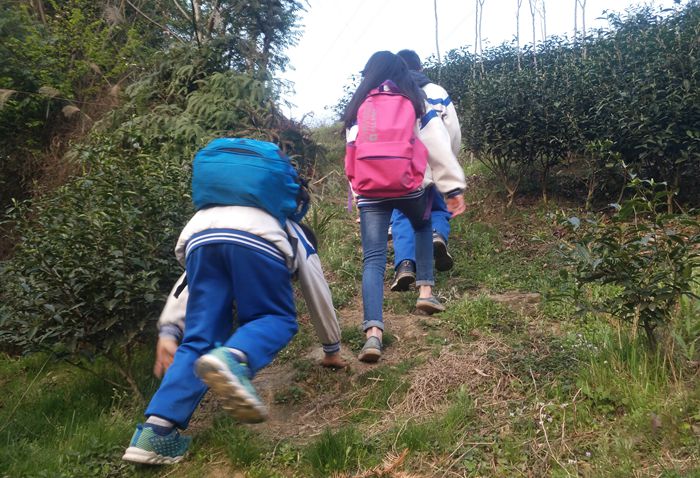 小学生上学之路,等修好了路之后,就可以坐拖拉机上学了,或者骑自行车上学了。