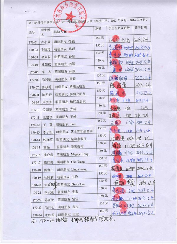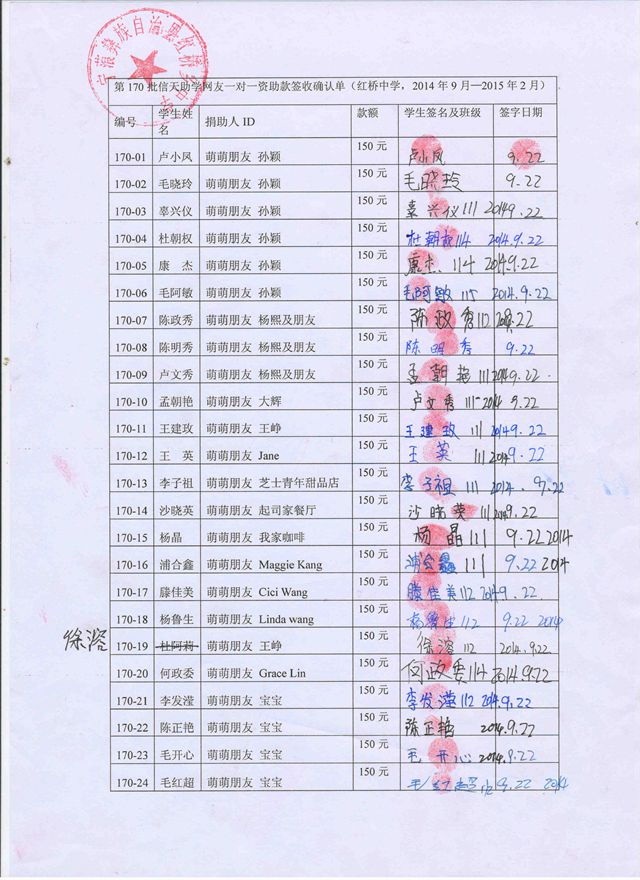 第170批红桥中学(2013年9月-2014年2月)受助生签收单