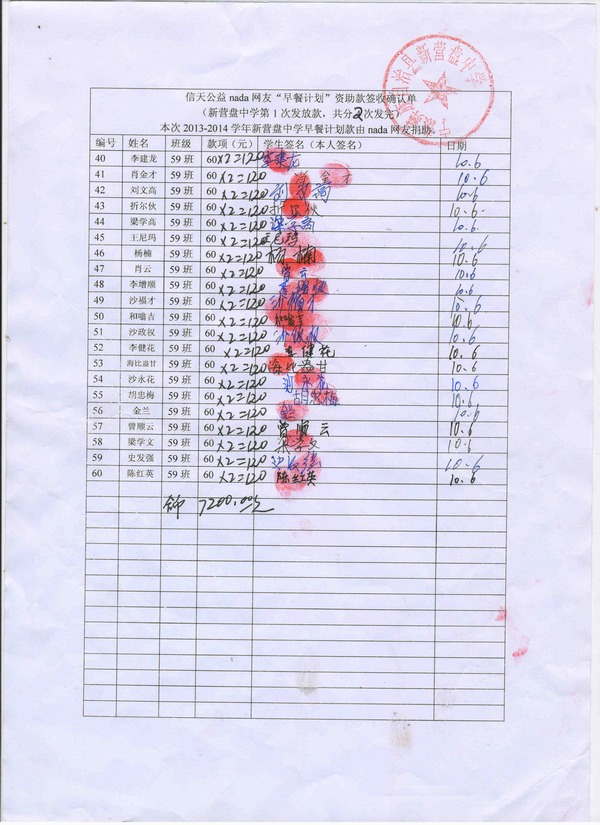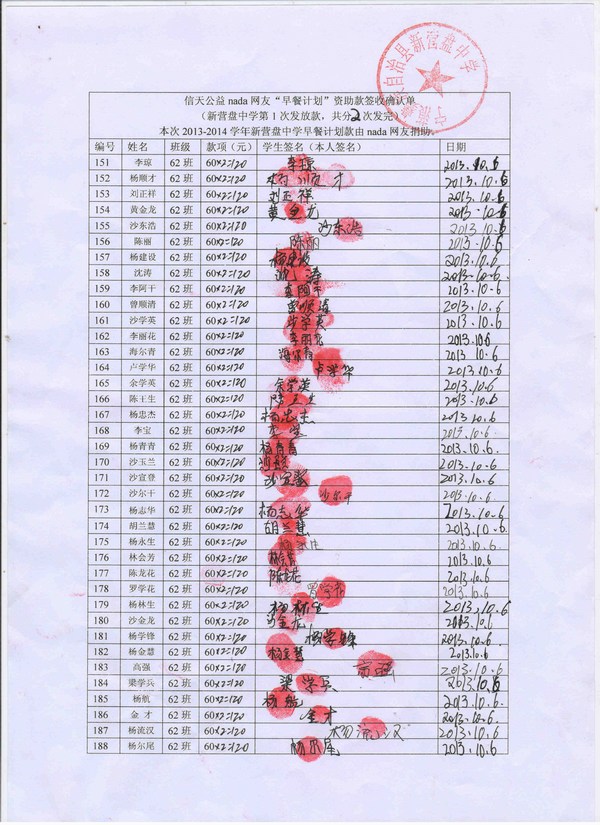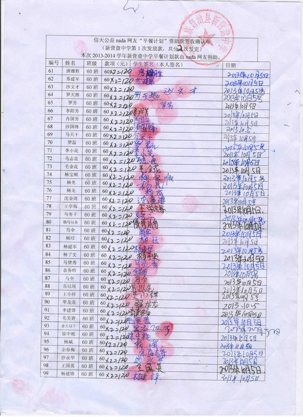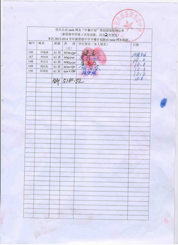 新营盘中学,2013-2014年早餐计划第一次发款签收单